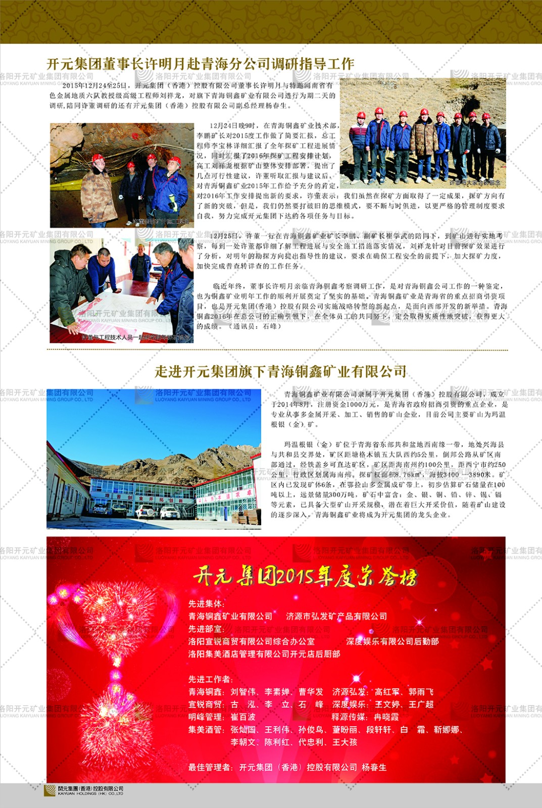 洛陽開元礦業(yè)集團(tuán)有限公司簡介洛陽開元礦業(yè)集團(tuán)有限公司,始成立于2006年,位于洛陽市開元大道269號。集團(tuán)旗下共有五余家全資子公司,業(yè)務(wù)涉及有色金屬礦山開發(fā)、礦產(chǎn)品購銷與進(jìn)出口貿(mào)易、房地產(chǎn)開發(fā)、文化藝術(shù)、企業(yè)管理與咨詢、資本投資等多個領(lǐng)域。民建河南省委委員、民建河南省委企業(yè)委副主任、民建洛陽市委委員、企業(yè)委主任、洛陽民建企業(yè)家協(xié)會會長許明月是公司創(chuàng)始人,現(xiàn)任洛陽開元礦業(yè)集團(tuán)有限公司董事長。在礦業(yè)領(lǐng)域,洛陽開元礦業(yè)集團(tuán)擁有多家實力雄厚的子公司:貴州開元礦業(yè)有限公司探、采礦權(quán)面積共11.33平方公里;興??h銅鑫礦業(yè)有限公司探礦權(quán)面積8.76平方公里,礦山資源潛力巨大;2021年,開元集團(tuán)與盧氏中科礦業(yè)有限公司開展戰(zhàn)略合作。盧氏中科礦業(yè)有限公司專注于有色金屬的浮選、加工和銷售,擁有強大的技術(shù)支撐平臺,是集探、采、選、冶、研為一體的中大型綜合礦業(yè)企業(yè)。目前,盧氏中科王家河1000噸選礦廠已成功投產(chǎn),雙河金礦、柳關(guān)欒盧鉛鋅礦相繼順利開工,樓房銀礦與圪老灣鉛鋅礦的深部探礦重大突破,標(biāo)志著礦山版圖取得重大進(jìn)展,為開元集團(tuán)后續(xù)發(fā)展奠定了堅實基礎(chǔ)。在文化傳媒領(lǐng)域,洛陽市明月美術(shù)館通過豐富多樣的藝術(shù)展覽、學(xué)術(shù)研討和公共教育活動,努力打造一個集展覽、交流、教育、研究為一體的綜合性藝術(shù)平臺。此外,在金融投資領(lǐng)域,開元集團(tuán)旗下的北京明峰資本管理有限公司專注于投資具有高增長潛力的優(yōu)秀企業(yè),特別是高科技、新能源、環(huán)保等新興產(chǎn)業(yè),為客戶提供個性化的資產(chǎn)配置服務(wù)。在做好企業(yè)經(jīng)營的同時,開元集團(tuán)始終不忘企業(yè)的社會責(zé)任和家國情懷,以突出的愛心公益事跡,開展了一系列公益慈善活動:“民建林”公益事業(yè)通過“思源基金”“幫幫公益”線上公益平臺,與眾多愛心人士籌措資金20余萬元;資助541名貧困大學(xué)生共計270余萬元,推進(jìn)“數(shù)字助力——河南AI人才培養(yǎng)”;捐款10萬元,馳援京津冀、黑龍江洪水地質(zhì)災(zāi)害……公司于2017年底被洛陽市慈善總會評為“洛陽慈善風(fēng)云榜——十大愛心集體”。洛陽開元礦業(yè)集團(tuán)有限公司秉承持續(xù)發(fā)展理念,憑借多年來良好的企業(yè)信譽與經(jīng)營業(yè)績,與全國多家企業(yè)建立了良好合作關(guān)系,受到社會各界的一致好評,多次榮獲“納稅標(biāo)兵”“先進(jìn)企業(yè)”“招商引資模范企業(yè)”等榮譽稱號?;赝麃頃r路,開元人勠力同心,以“闖”的精神和“創(chuàng)”的勁頭,一路披荊斬棘,踏過千山萬水;展望新未來,開元人凝心聚力,不執(zhí)于“舊”,無畏于“新”,秉承“勇于跨越,追求卓越”的企業(yè)精神,乘著國家高質(zhì)量發(fā)展新征程的東風(fēng),跨過高山,越過大海,向著集團(tuán)多元化、國際化的目標(biāo),逐夢遠(yuǎn)航,跨越前行!